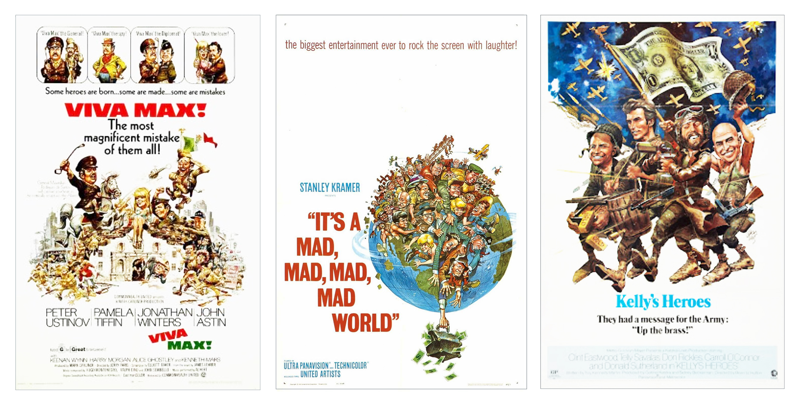 And in fact, by this time, Davis had already applied his comedic style to posters for 1963’s It’s a Mad, Mad, Mad, Mad World, 1969’s Viva Max!, and 1970’s Kelly’s Heroes. Those posters featured the caricatured stars in a mass of frenzied humanity or satirical posing.